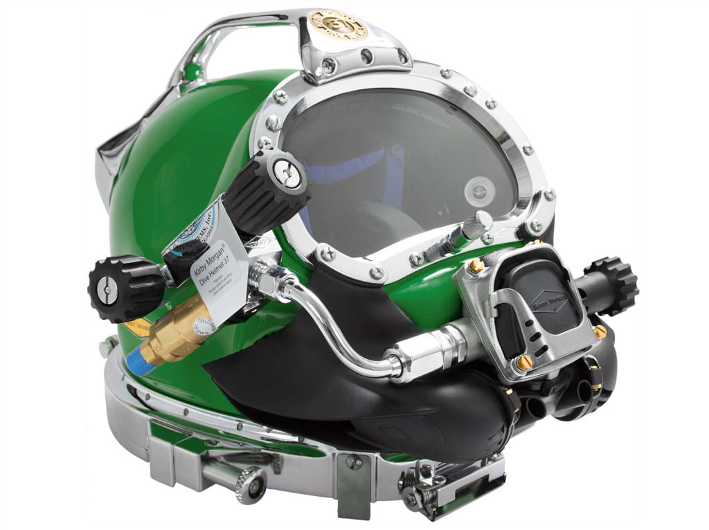 Hełm nurkowy Kirby Morgan 37 jest standardowo wyposażony w układ wydechowy Quad-Valve™, który ma mniejszy opór oddychania niż starszy układ wydechowy z pojedynczym zaworem, zapewniając jednocześnie wyjątkowo suchy czepiec. Zbalansowany automat 455 zastosowany w Kirby Morgan® 37 to wykonany w całości ze stali nierdzewnej regulator o doskonałej wydajności oddychania. Kirby Morgan 37 to jedna z najpopularniejszych konstrukcji na świecie. Jest uważany za standard w branży nurkowania komercyjnego, a także w marynarce wojennej USA. Wybierz Kirby Morgan 37, jeśli potrzebujesz wytrzymałego hełmu nurkowego o tradycyjnym wyglądzie.