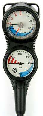 Konsola nurkowa składająca się z trzech elementów - manometr, kompas oraz głębokościomierz.