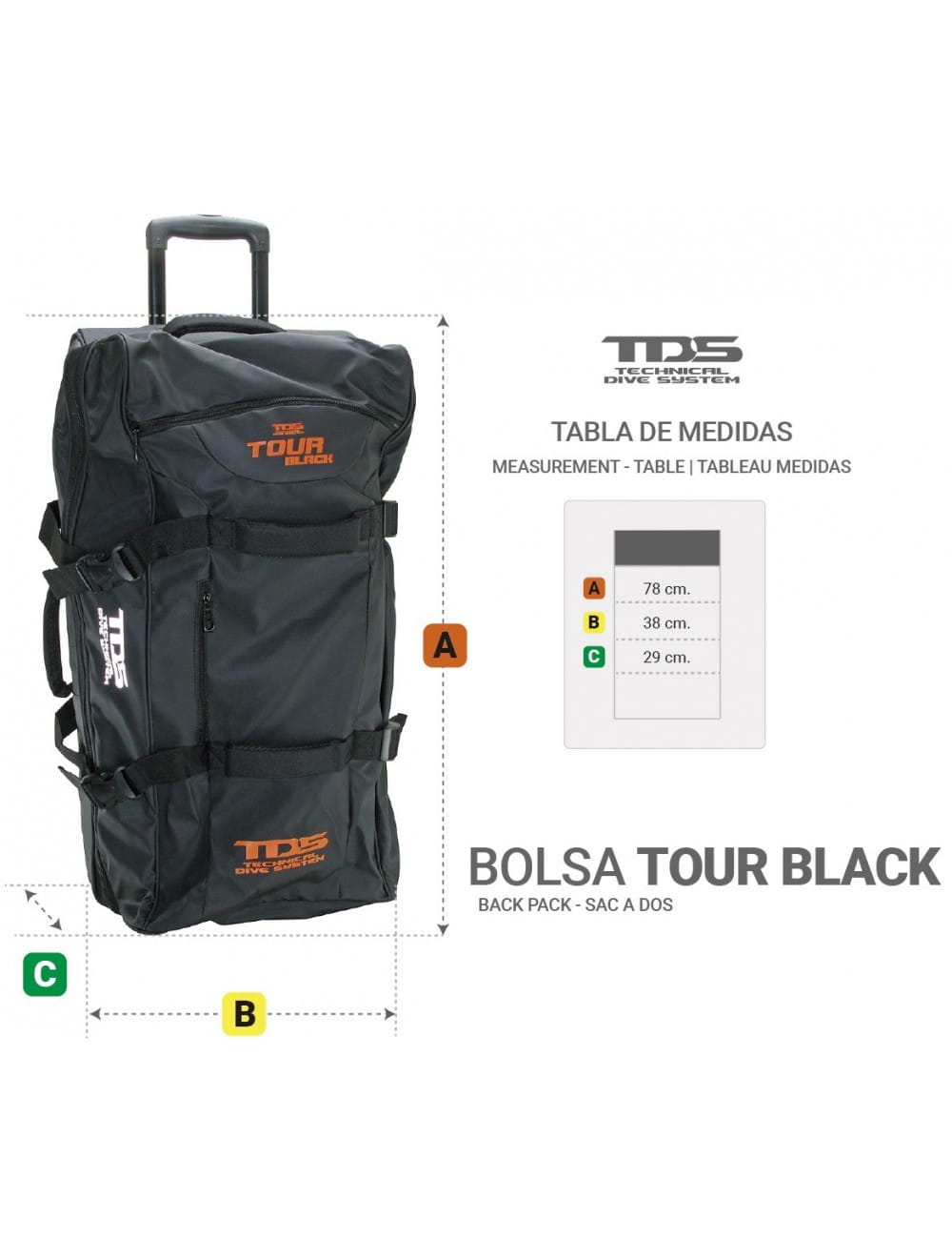 Torba TDS Tour jest wykonana z wytrzymałego materiału. Wydłużony kształt zapewnia dużą pojemność do wygodnego przenoszenia sprzętu nurkowego. Komora ładunkowa ma również zamek błyskawiczny na całym obwodzie, co pozwala na całkowite otwarcie i ułatwia pakowanie.
