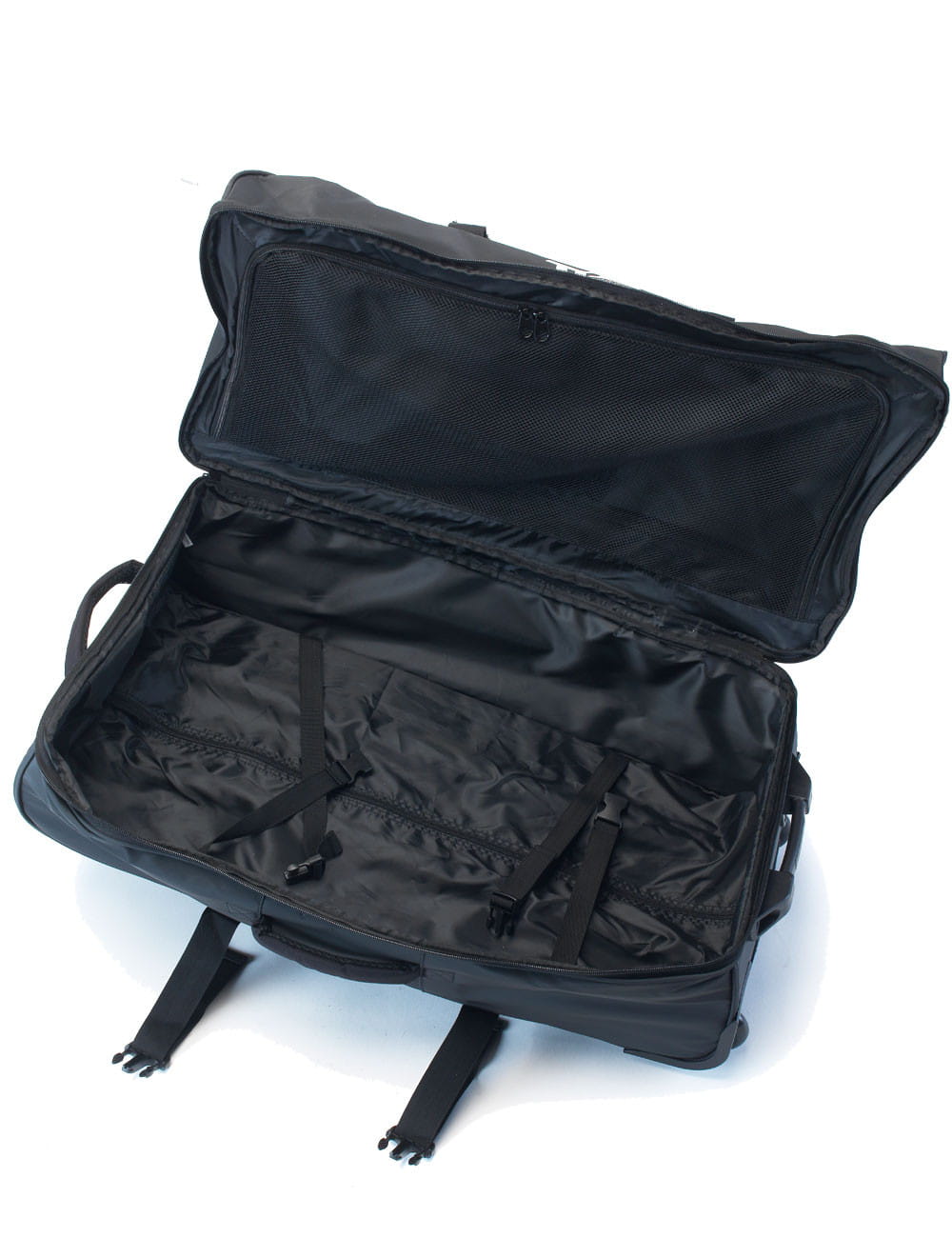 Wnętrze zawiera dwa pasy do mocowania bagażu i drugą mniejszą komorę po stronie zamknięcia, z siatką i obwodowym zamkiem błyskawicznym.